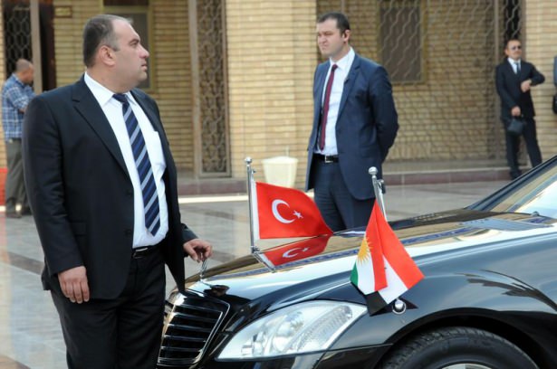 davutoğlunu peşmergeler koruyor ve arabasında bayrağı var